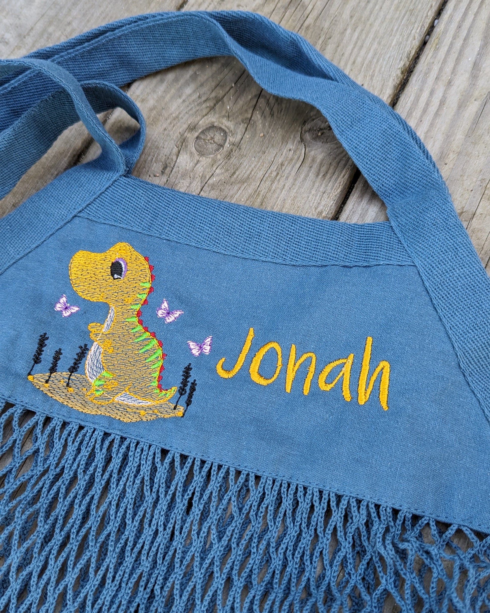 Der obere Teil des Beutels kann nach Wunsch mit Namen, Spruch oder Motiv bestickt werden. So wird der Netzbeutel nicht nur praktisch, sondern auch ein ganz persönliches Accessoire für dein Kind.