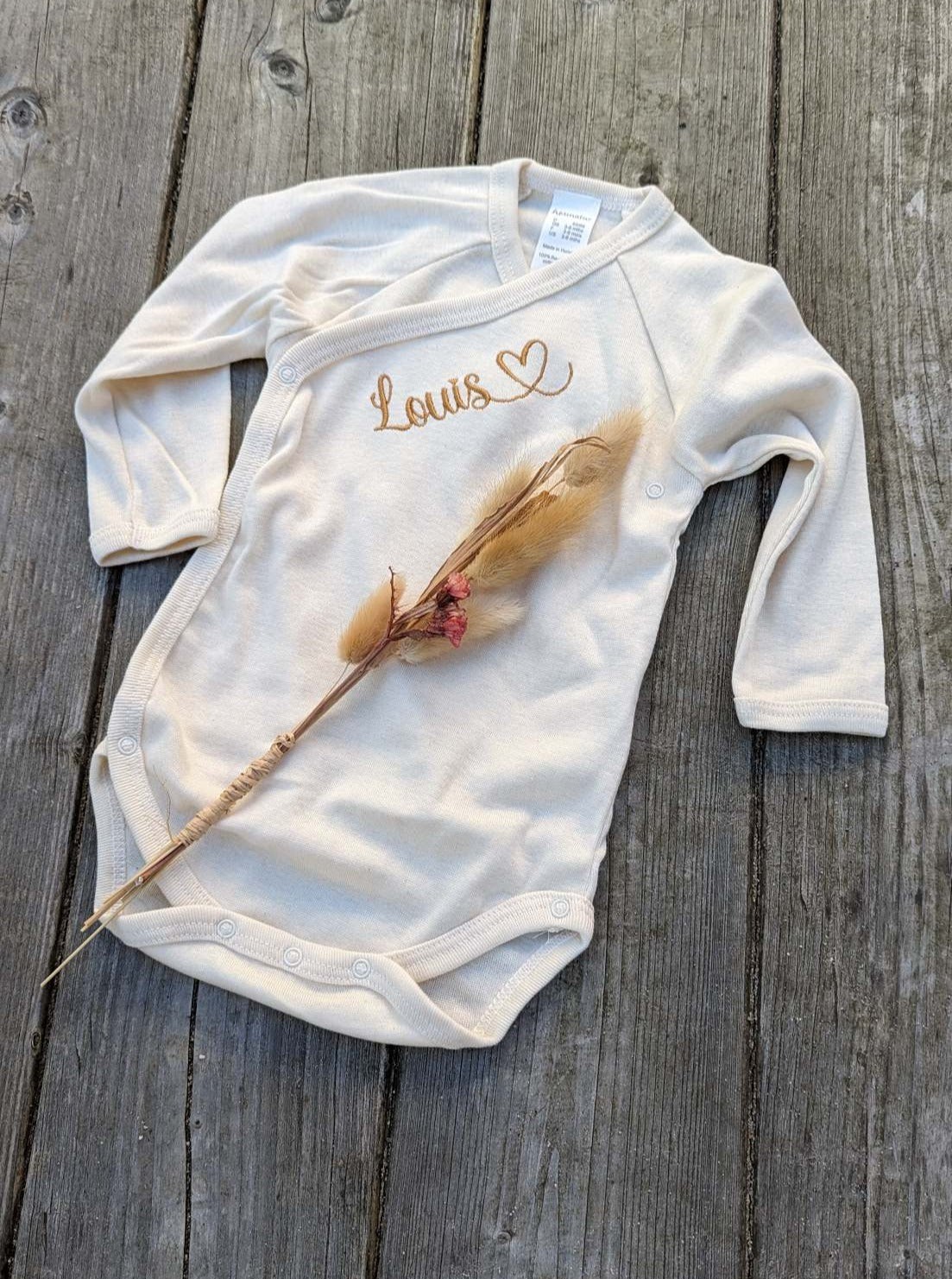 Dieser hochwertige Wickelbody ist nicht nur praktisch, sondern auch ein wunderschönes Andenken an die Babyzeit. Mit einer individuellen Bestickung wird er zu einem ganz besonderen Geschenk zur Geburt oder Taufe.